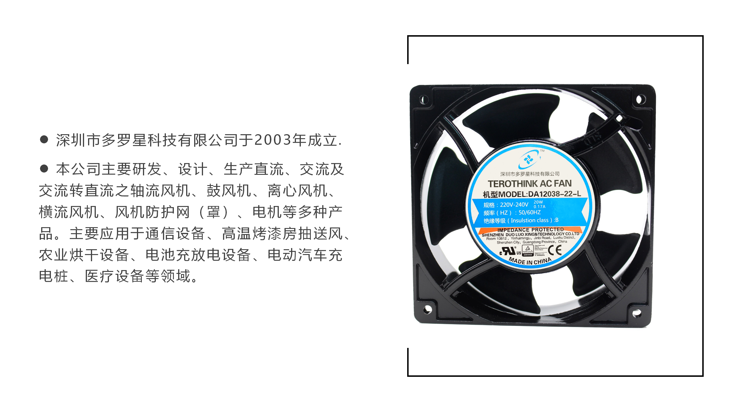 深圳市多羅星科技有限公司成立于2003年,以高品質、優質服務和高性價比屹立行業十數載。經過多年發展,廣納高級人才,從單純的散熱方案提供商升級為提供各種特殊散熱風機,特種耐高溫馬達設計于一體的設計性方案解決公司,被廣大客戶廣泛認同和使用。 公司產品涵蓋軸流風機、離心風機、外轉式風機、橫流風機等,擁有發那科、昭和、施樂百、福佑、EBM等德國、日本、臺灣知名散熱廠商品牌的代理及經銷權。研發團隊為多家外資商用設備及南方電網,國家電網,中國中車等等提供各種變頻,可調速,耐高溫以及超耐高溫馬達產品。我們以“專注品質,用心服務”為核心價值,秉承以用戶需求為依歸,致力于技術創新和平臺化運營,通過不斷提升專業水平和不懈努力,讓客戶以高性價比、快速搭配出完善的散熱和調速馬達方案。